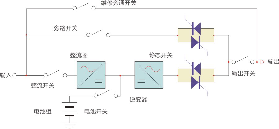 由12只SCR(可控硅)組成逆變器側(cè)和旁路側(cè)雙路無(wú)觸點(diǎn)靜態(tài)開關(guān),確保逆變器供電與旁路供電之間的無(wú)間斷切換,并保證輸出電壓波形的連續(xù)和平滑性??刂齐娐凡捎昧恕斑^(guò)零點(diǎn)”切換技術(shù),保證了UPS在同步鎖相切換時(shí)間為0ms,與電網(wǎng)不同步時(shí),切換時(shí)間小于4ms,即電網(wǎng)頻率無(wú)論怎樣變化,均可確保UPS輸出電壓,頻率的穩(wěn)定與不間斷。