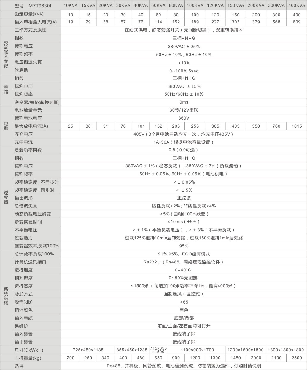 MZT9830L 中大功率三相輸入三相輸出系列 UPS ,單機(jī)容量從 10KVA 到 400KVA ,該系列產(chǎn)品是采用先進(jìn)的 DSP 數(shù)字化技術(shù),配合高速 16 位數(shù)字芯片、