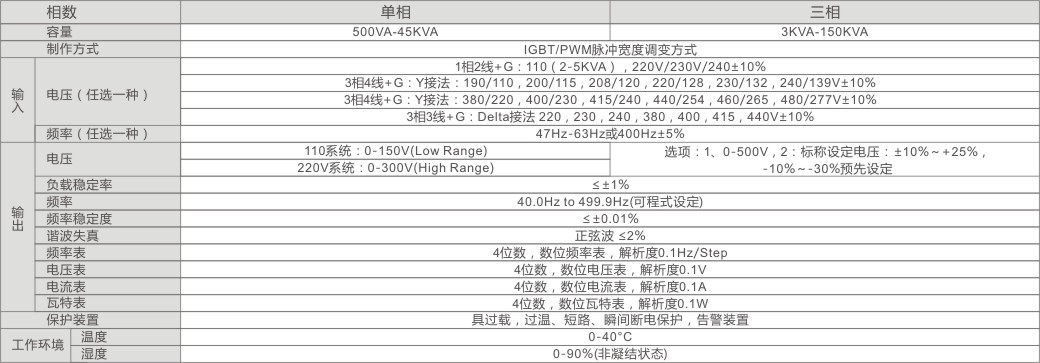 本系列產(chǎn)品提供電壓0-300V及頻率40-499.9Hz可程式指拔設(shè)定功能,它不僅適合一般商業(yè)產(chǎn)品(47-60Hz)的測試應(yīng)用外,也可以支持高達(dá)400Hz需求的軍事、航空電子及通訊上的應(yīng)用。
