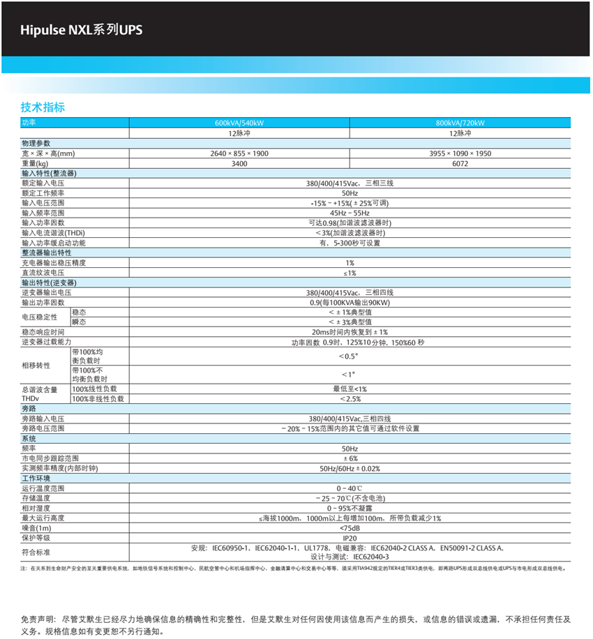 主要技術特點 < 在線式雙變換設計,完全隔離市電及油機可能存在的各類電網(wǎng)污染及電網(wǎng)故障對負載的影響; < 輸出功率因數(shù)提升至0.9,更